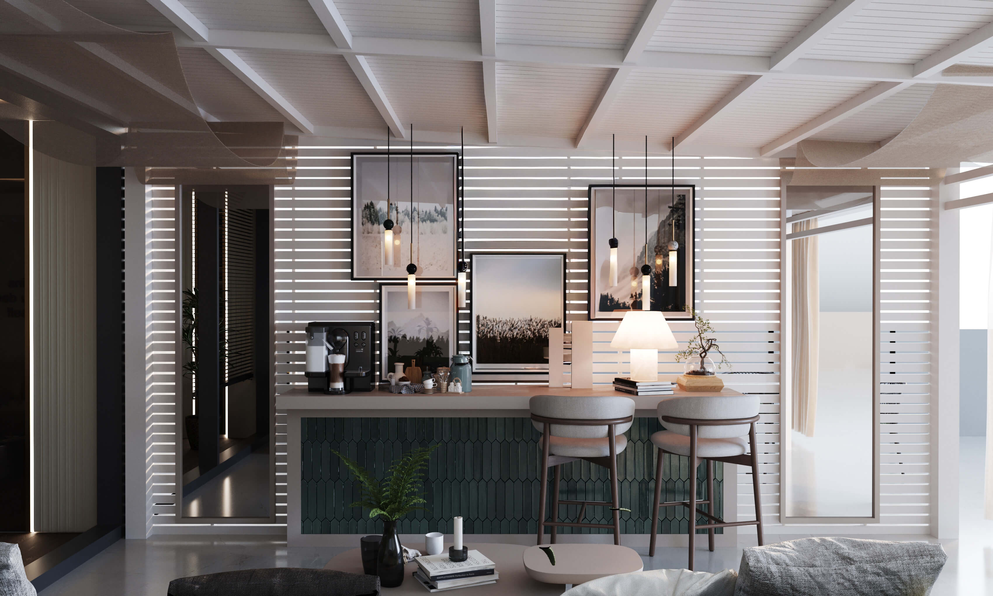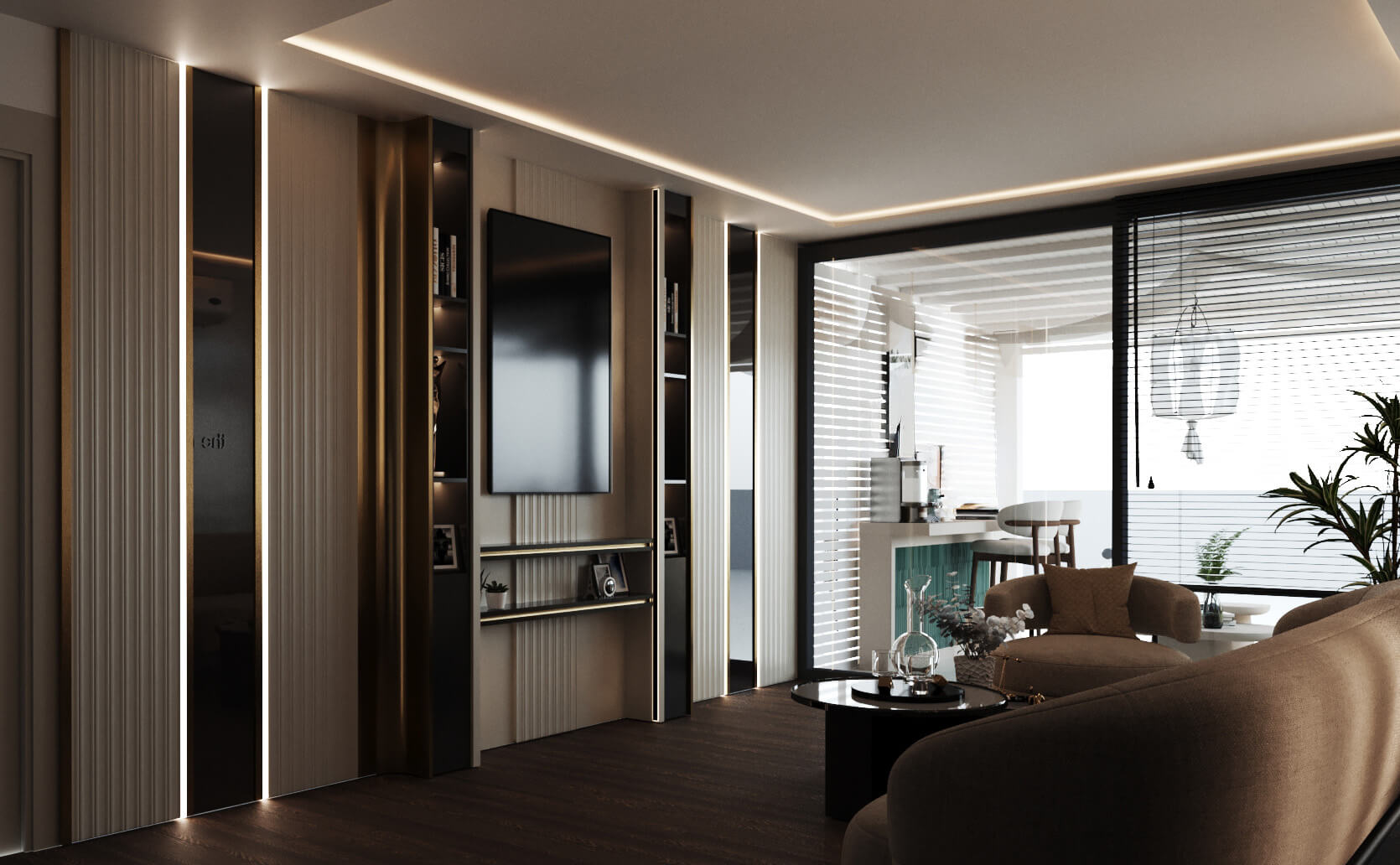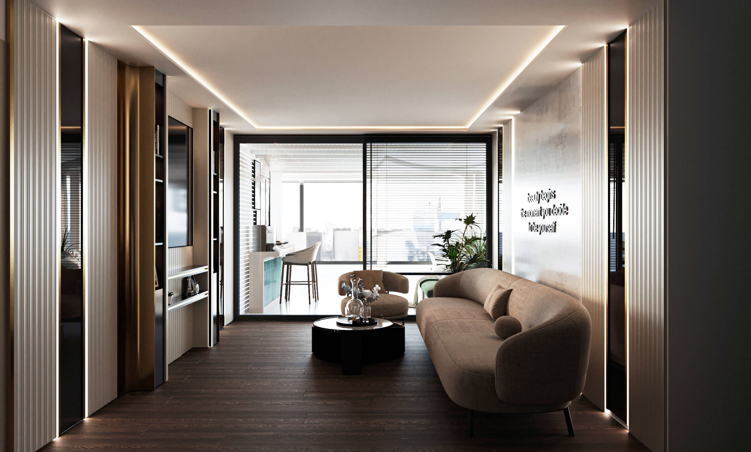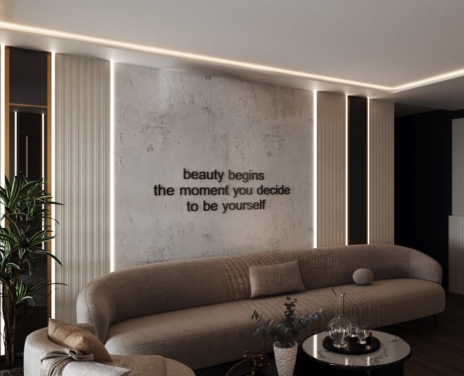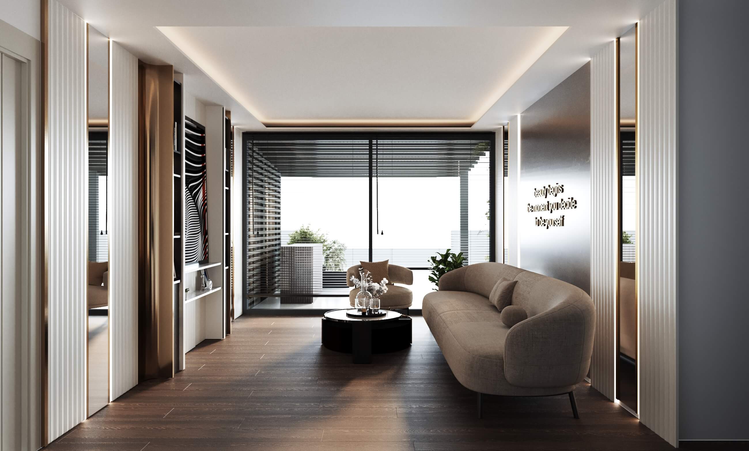 Bu Klinikte amacımız , estetik ve işlevselliği harmanlayarak hastaların kendilerini özel ve güvende hissedecekleri bir ortam yaratmaktı. Duvar ünitesinde kullandığımız form ve yüzey dokusu sakinleştirici bir etki yaratırken, kavisli koltuk ve altın eskitme detaylar, bekleme alanına sofistike bir estetik katıyor. Duvar kaplaması üzerine yerleştirdiğimiz motto, kliniğinin temel amacını yansıtıyor: Hastalara dış görünümleriyle ilgili özgüven ve pozitif bir deneyim yaşatmak! Teras alanı, kliniğe gelen ziyaretçilerin hem iç hem de dış mekanda kendilerini rahat hissetmeleri için tasarlandı. Şehrin dinamik manzarasına bakan teras, doğal ışıkla dolu ve huzur verici bir kaçış alanı. Burası, klinik öncesi ya da sonrası hastaların kısa bir süreliğine de olsa rahatlayabileceği bir alan. Hastalar, tedavi öncesi ve sonrası süreçlerde rahatlayabilecekleri, kendilerini değerli hissedecekleri bir ortamda bulunuyor.