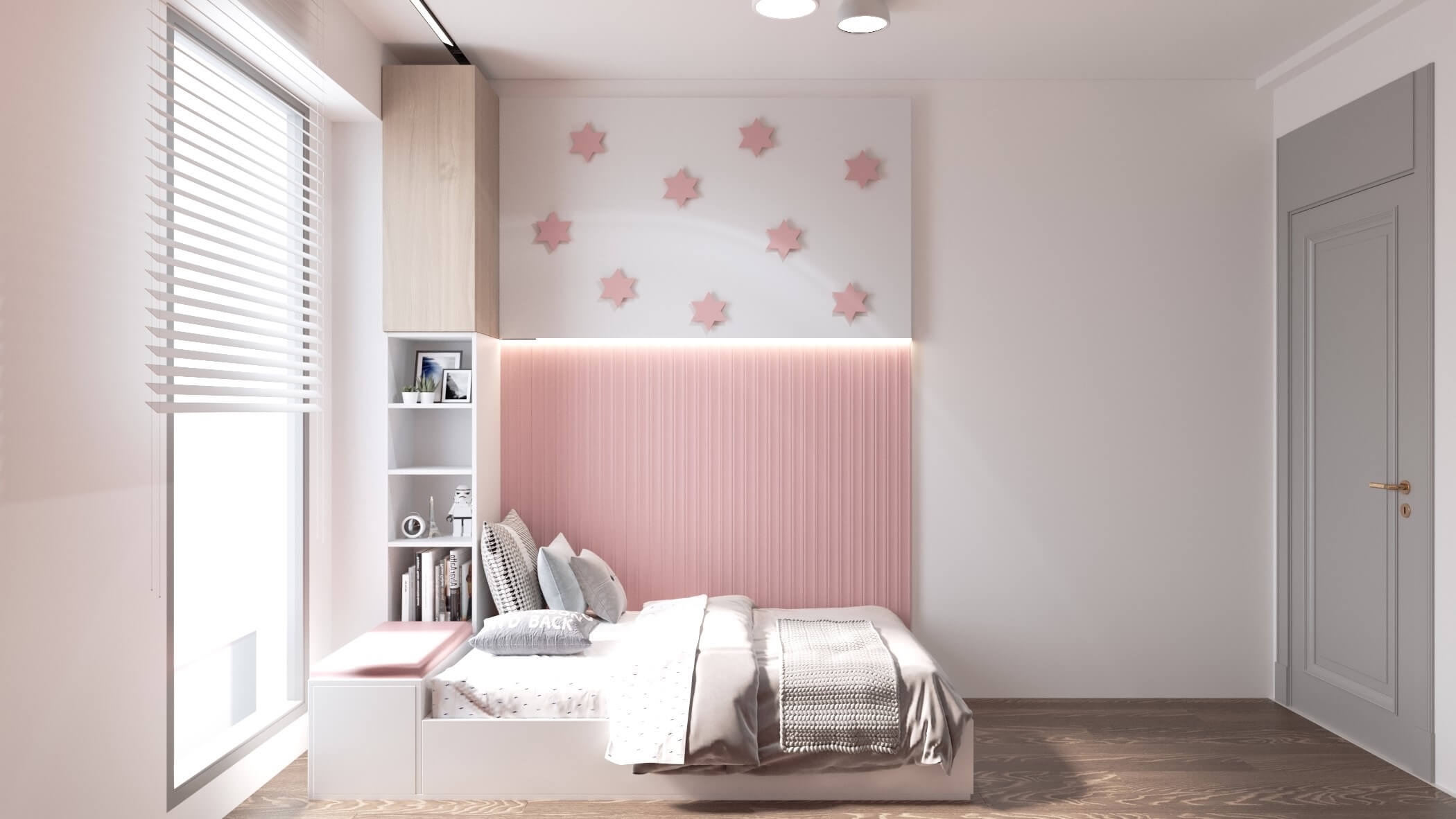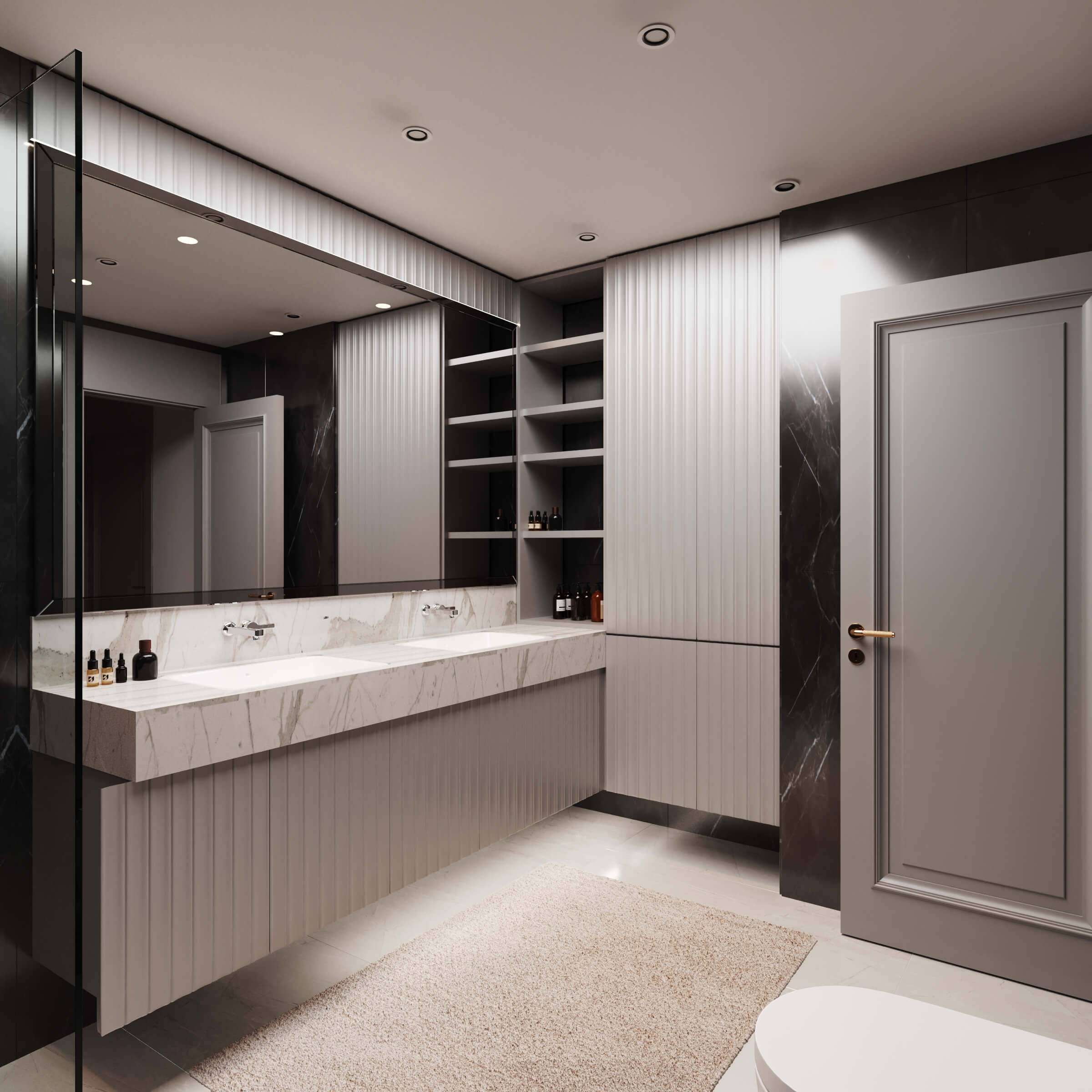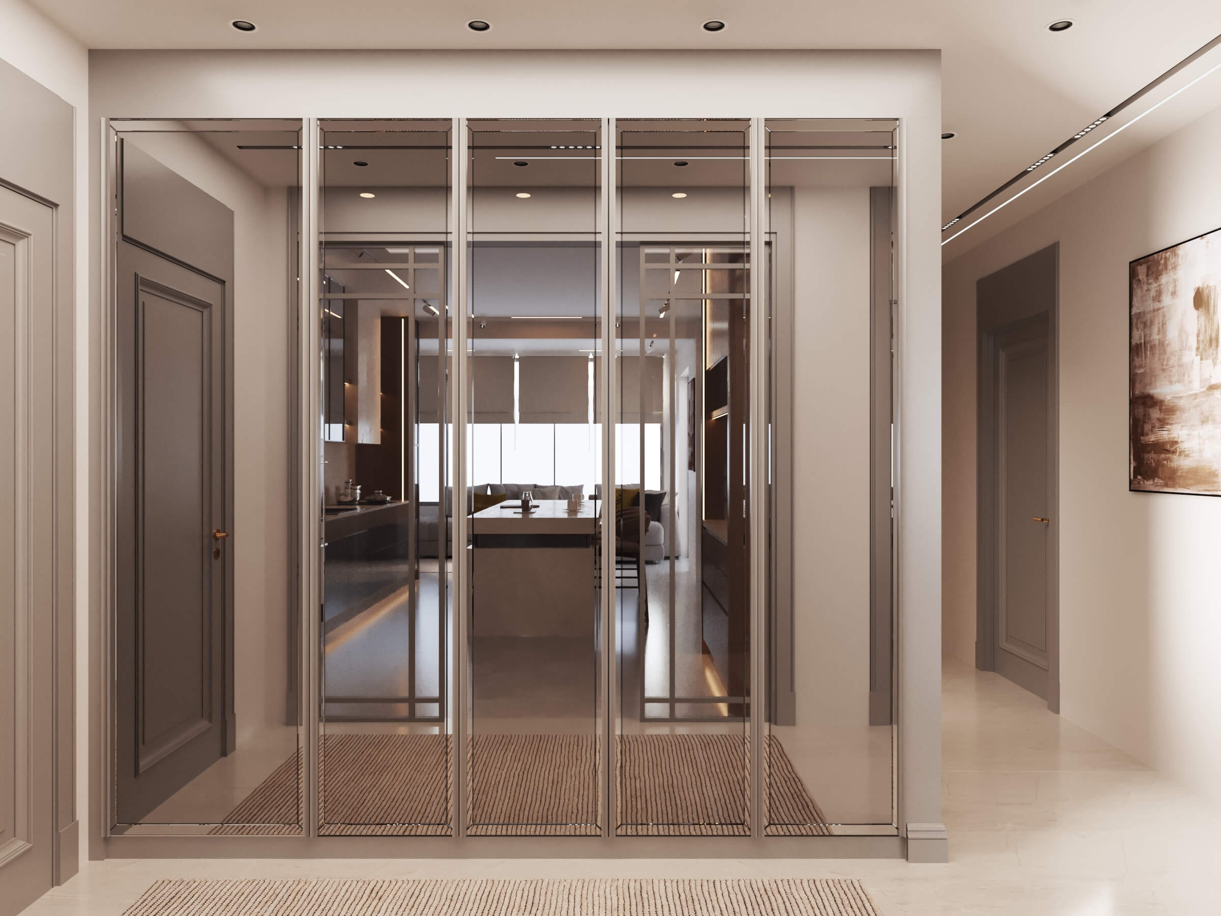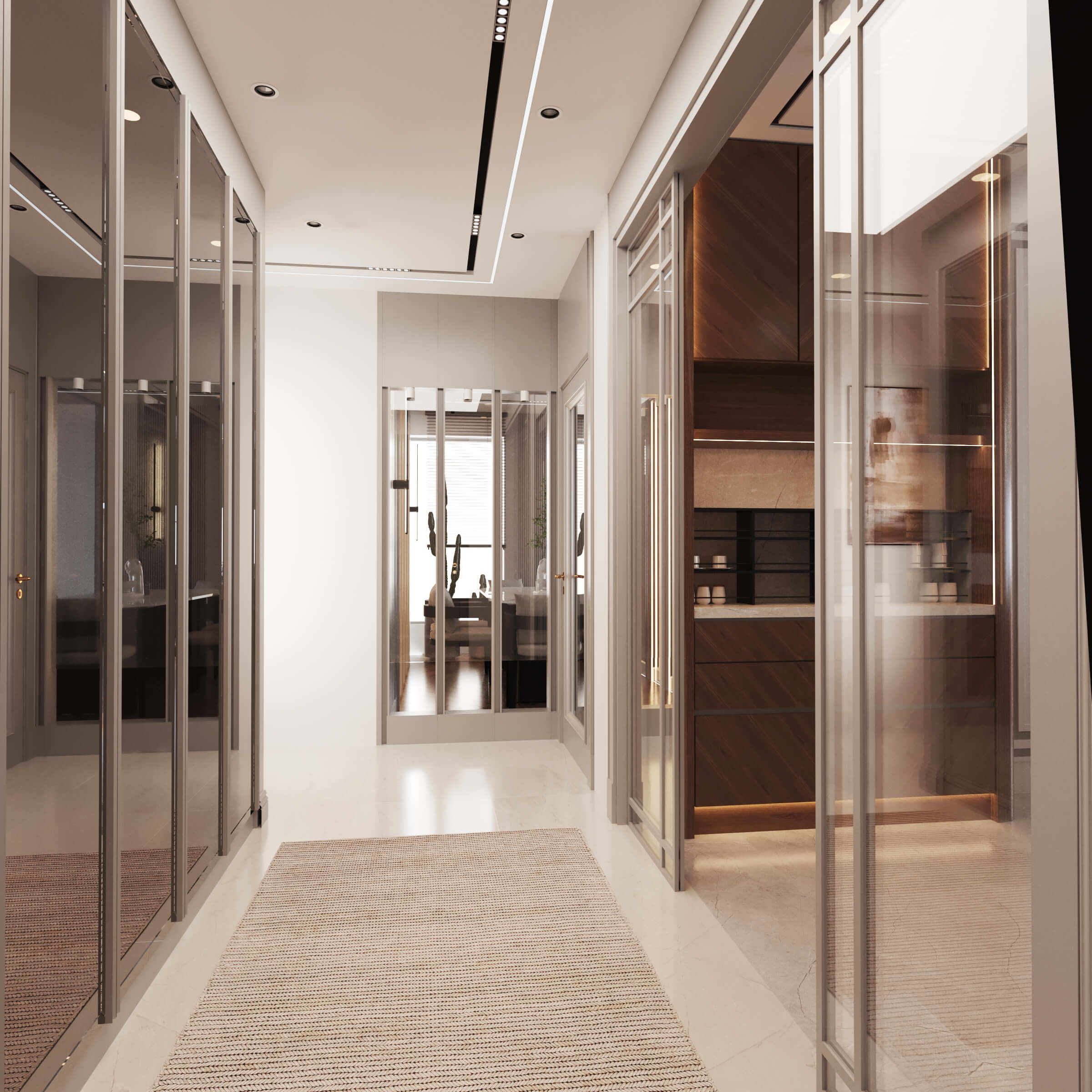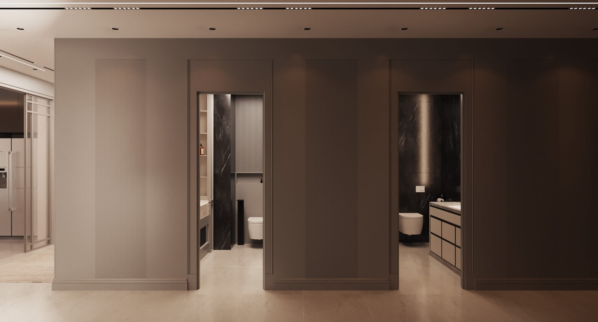 Temelde tek tip tasarlanan dairelerde kullanıcı seçimleri ile temel rengi gri kullanılan dairedeyiz. Giriş, antre alanlarının planlarının aynı, yüzeylerinin birbirinden farklı olması, dairelerin kişiselleştirildiğini gösteriyor. Mutfak, kiler sistemleri ve ocak-evye konumunun aile yoğunluğunun etkisiyle şekillendiği bir planlama ile hazırlandı. Belirli alanlarda kullanılan doğal malzeme, bu dairenin genel görüntüsünde sıcak bir his yaratıyor. Çocuk odaları metrekareleri bazında en verimli haliyle tasarlandı. Çocukların kişisel tercihleriyle şekillenerek uzun vadede kullanımlarına hizmet edecek.