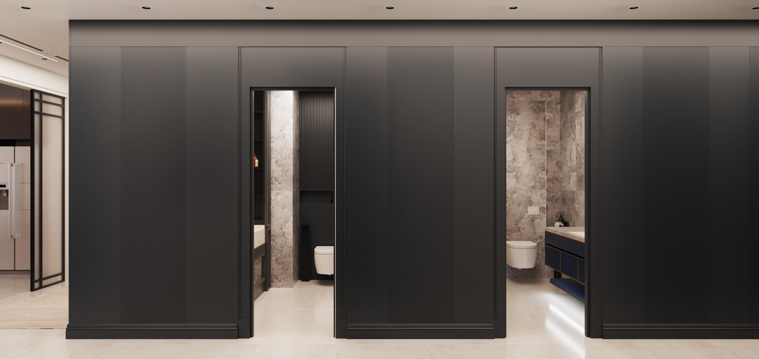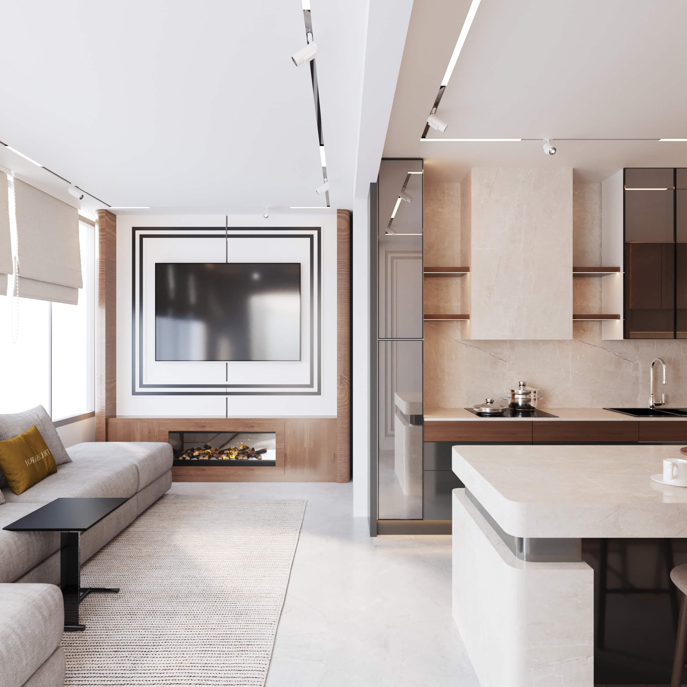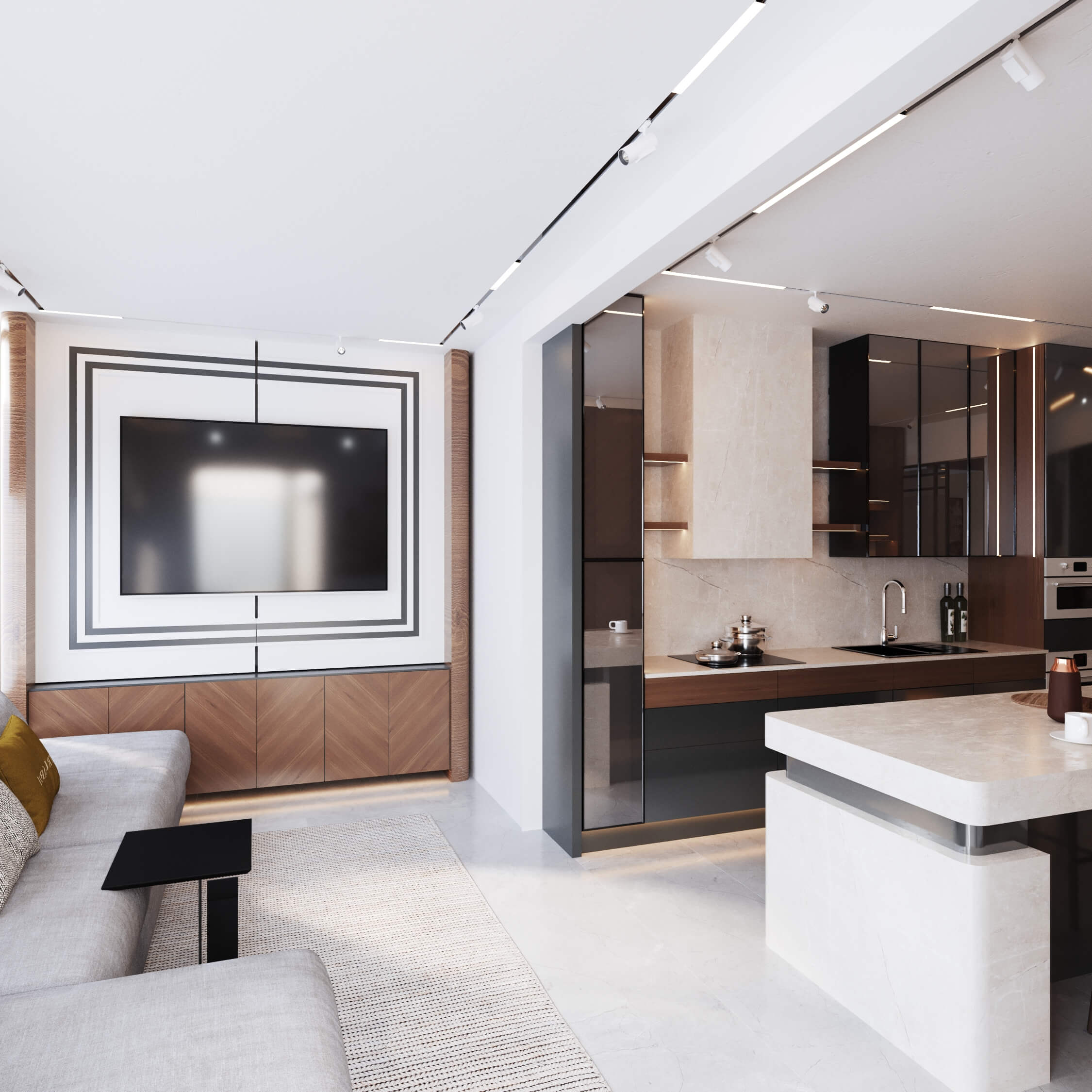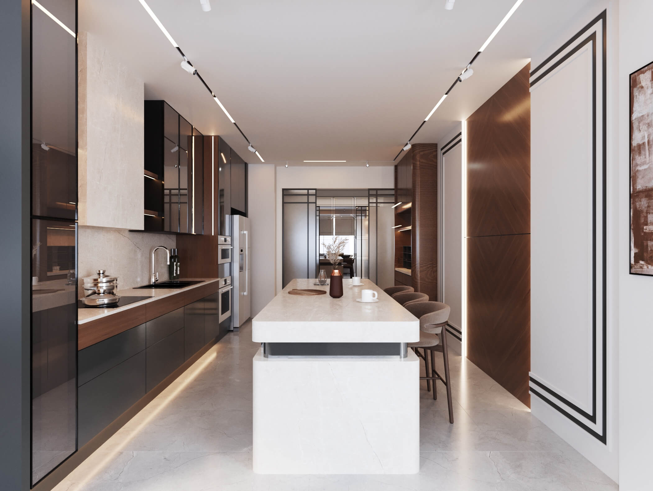 Renk paletinde antrasit, bej ve ahşap tonlarını bir arada kullanarak; malzeme seçimleriyle birleşince modern lüks algısı oluşturduğumuz bir daire tasarladık. Kullanıcımızın temel isteği koyu renkler dairenin geneline hakim. Mutfak, farklı işlenmiş ürünleri; meşe kaplama, parlak lak panel, farklı renklerde lake yüzeyleri bir araya getirdiğimiz bir tasarım diliyle oluşturuldu. Mutfakta ahşap kaplama kullandığımız özel bir Kahve köşesi tasarladık.Doğal ürünler bulunduğu mekanda kullanıcıya aitlik hissi veren dokulardır. Meşe kaplamamız da kendi imalatımız olan balıksırtı desen tercih ettik. Doğal şıklık ve dayanıklılık olarak ön plana çıkan meşe kaplama iç mekanlarda mekanın statüsünü yükseltir. Tasarladığım ada formunu oluşturabileceğimiz, aynı zamanda görsel olarak tasarımı tamamlayacak oval hatlı ada modülünde kuvars tezgah kullandık.