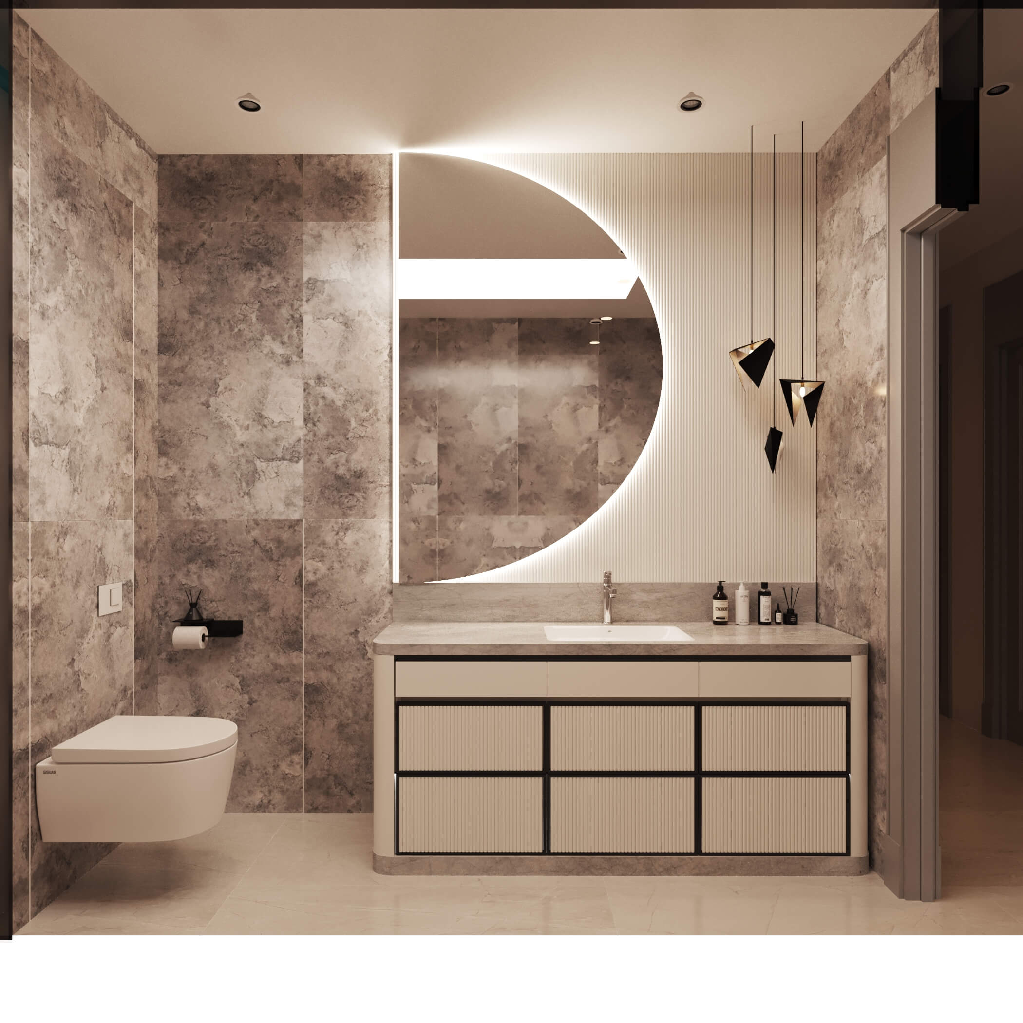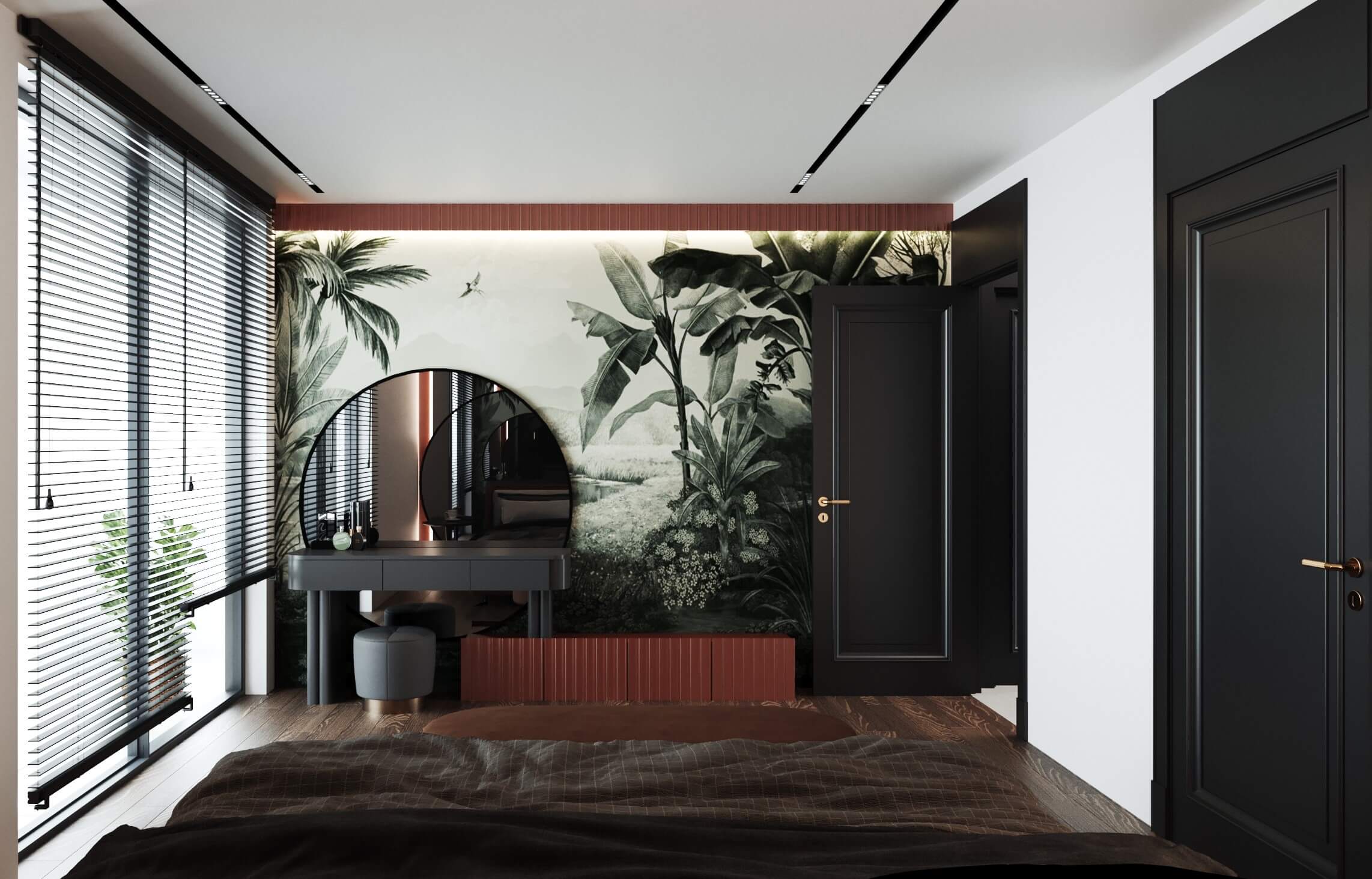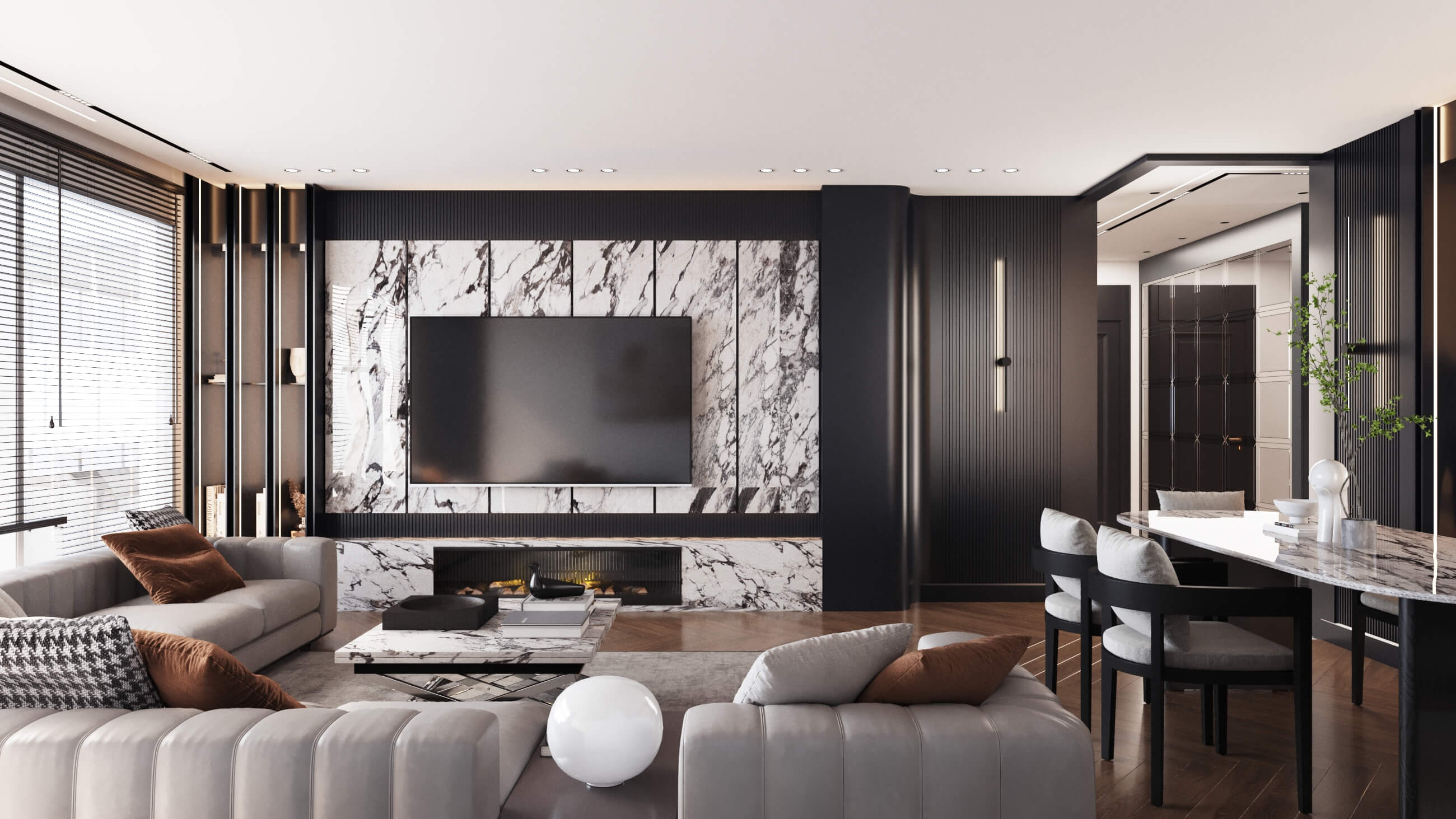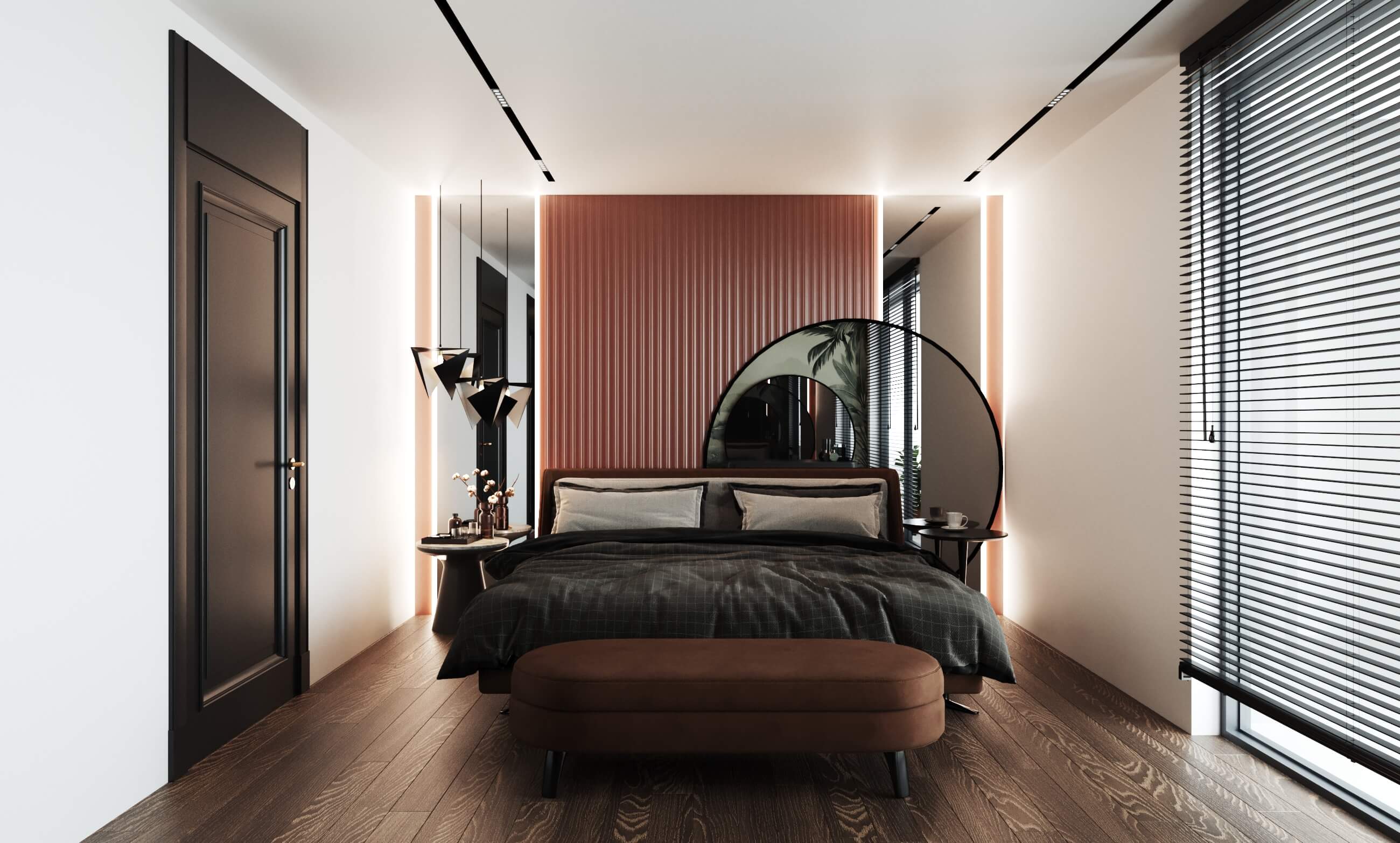 Renk paletinde antrasit, bej ve ahşap tonlarını bir arada kullanarak; malzeme seçimleriyle birleşince modern lüks algısı oluşturduğumuz bir daire tasarladık. Kullanıcımızın temel isteği koyu renkler dairenin geneline hakim. Mutfak, farklı işlenmiş ürünleri; meşe kaplama, parlak lak panel, farklı renklerde lake yüzeyleri bir araya getirdiğimiz bir tasarım diliyle oluşturuldu. Mutfakta ahşap kaplama kullandığımız özel bir Kahve köşesi tasarladık.Doğal ürünler bulunduğu mekanda kullanıcıya aitlik hissi veren dokulardır. Meşe kaplamamız da kendi imalatımız olan balıksırtı desen tercih ettik. Doğal şıklık ve dayanıklılık olarak ön plana çıkan meşe kaplama iç mekanlarda mekanın statüsünü yükseltir. Tasarladığım ada formunu oluşturabileceğimiz, aynı zamanda görsel olarak tasarımı tamamlayacak oval hatlı ada modülünde kuvars tezgah kullandık.