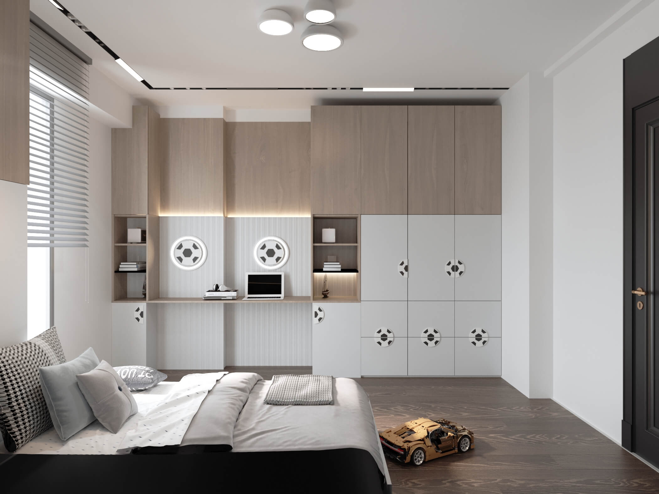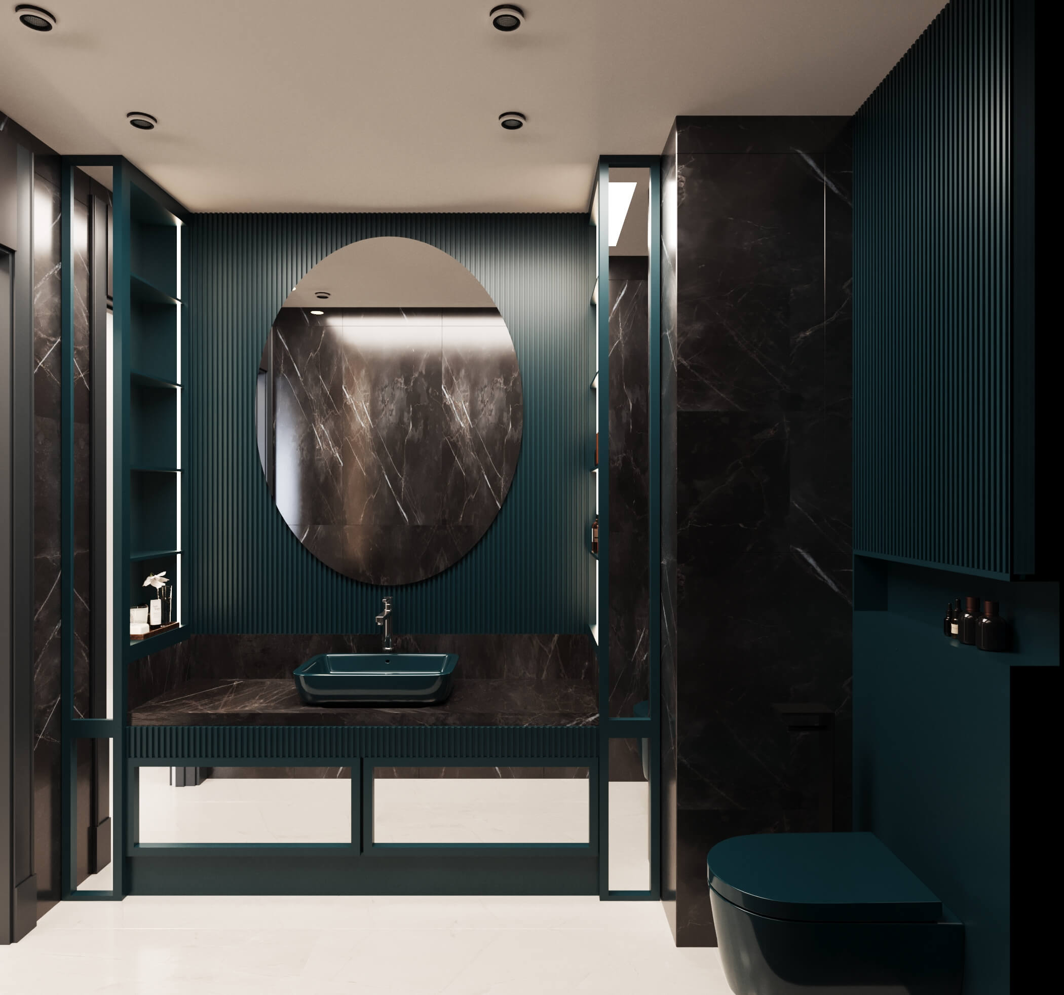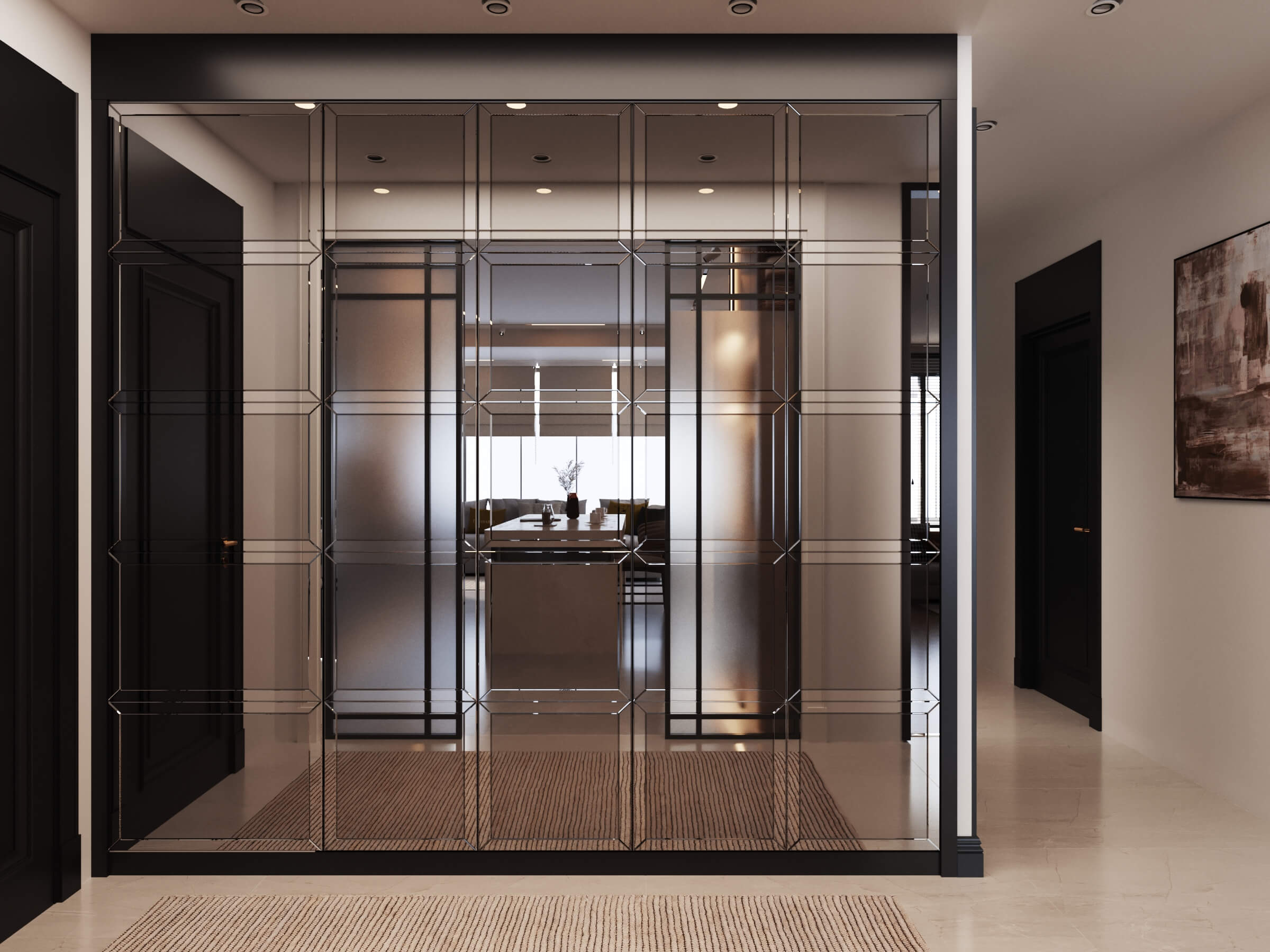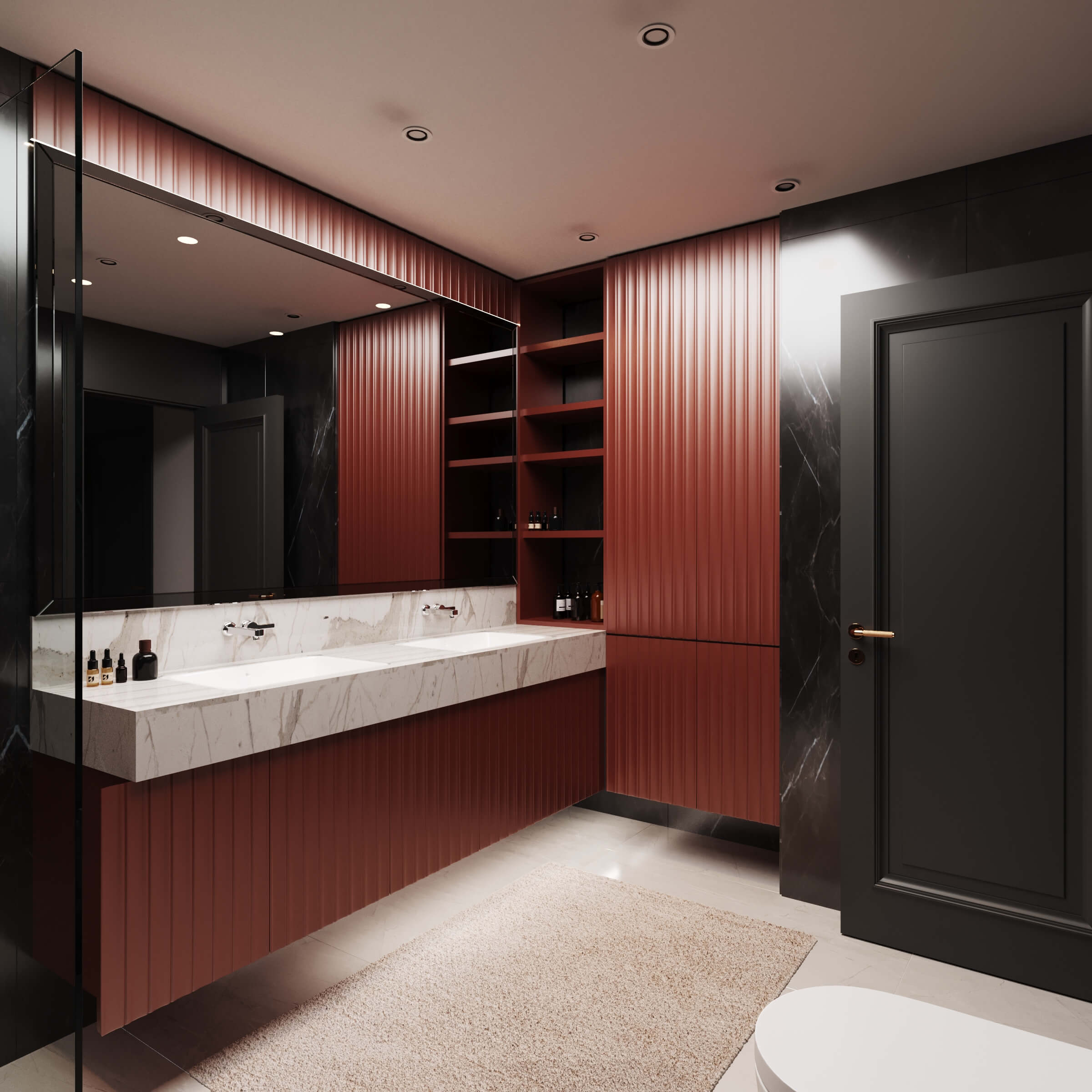 Renk paletinde antrasit, bej ve ahşap tonlarını bir arada kullanarak; malzeme seçimleriyle birleşince modern lüks algısı oluşturduğumuz bir daire tasarladık. Kullanıcımızın temel isteği koyu renkler dairenin geneline hakim. Mutfak, farklı işlenmiş ürünleri; meşe kaplama, parlak lak panel, farklı renklerde lake yüzeyleri bir araya getirdiğimiz bir tasarım diliyle oluşturuldu. Mutfakta ahşap kaplama kullandığımız özel bir Kahve köşesi tasarladık.Doğal ürünler bulunduğu mekanda kullanıcıya aitlik hissi veren dokulardır. Meşe kaplamamız da kendi imalatımız olan balıksırtı desen tercih ettik. Doğal şıklık ve dayanıklılık olarak ön plana çıkan meşe kaplama iç mekanlarda mekanın statüsünü yükseltir. Tasarladığım ada formunu oluşturabileceğimiz, aynı zamanda görsel olarak tasarımı tamamlayacak oval hatlı ada modülünde kuvars tezgah kullandık.